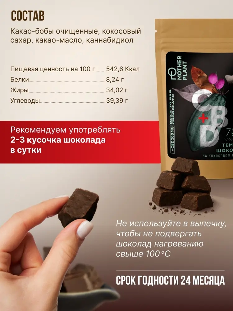 Шоколад от MotherPlant – это не просто шоколадка, это настоящее лакомство для истинных ценителей вкуса и здоровья. Этот темный шоколад на кокосовом сахаре с высоким содержанием какао (70%) и добавлением каннабидиола (CBD) 200 мг – настоящий источник энергии и бодрости. Он поможет справиться с нервным напряжением, тревогой и стрессом, а также улучшит настроение и повысит концентрацию внимания.