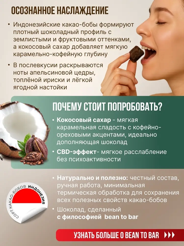 Этот шоколад ручной работы обладает глубоким шоколадным профилем, а кофейно-карамельный вкус кокосового сахара добавляет ему особый шарм. Послевкусие наполнено нотами апельсина, конфет тоффи и ягодной настойкой.